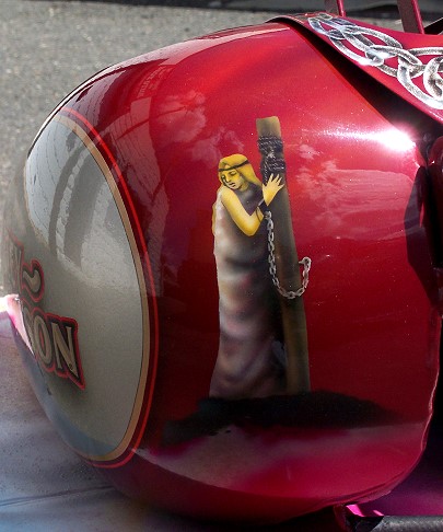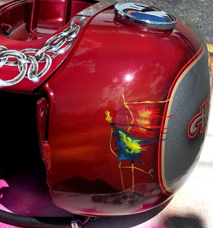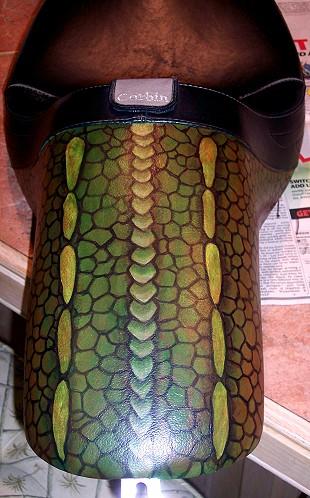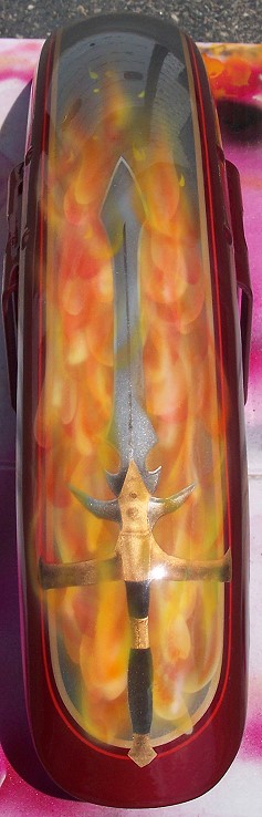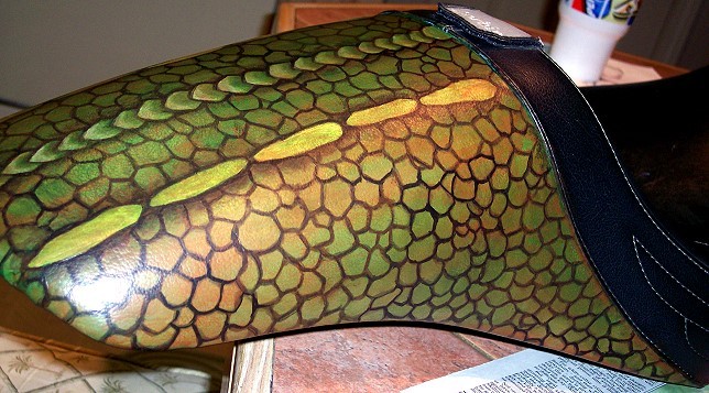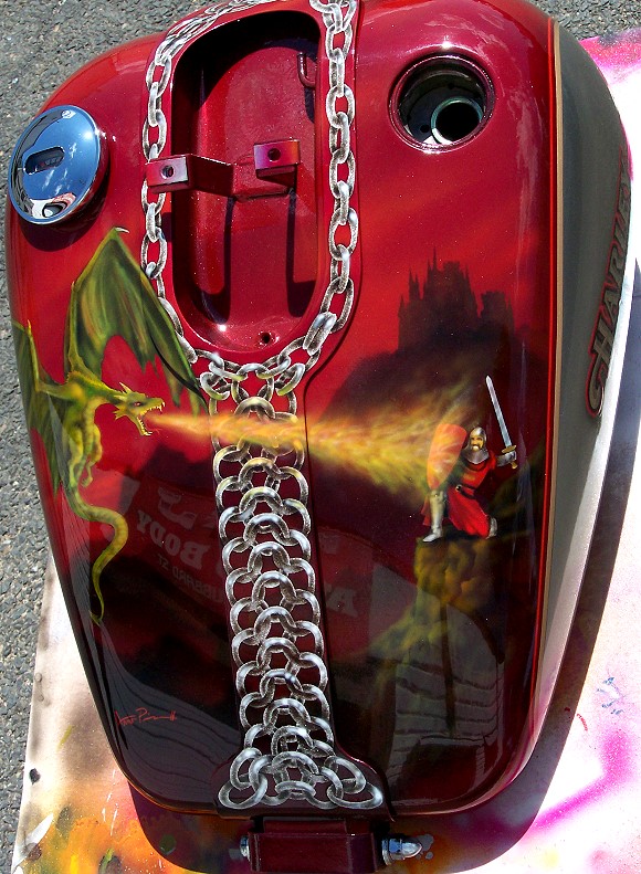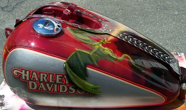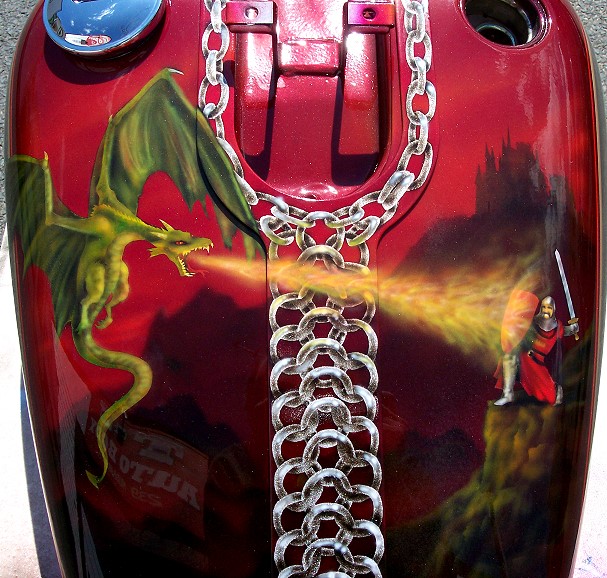 I airbrushed the tank, front fender, and the seat of this Harley Davidson with a dragon and knight theme.